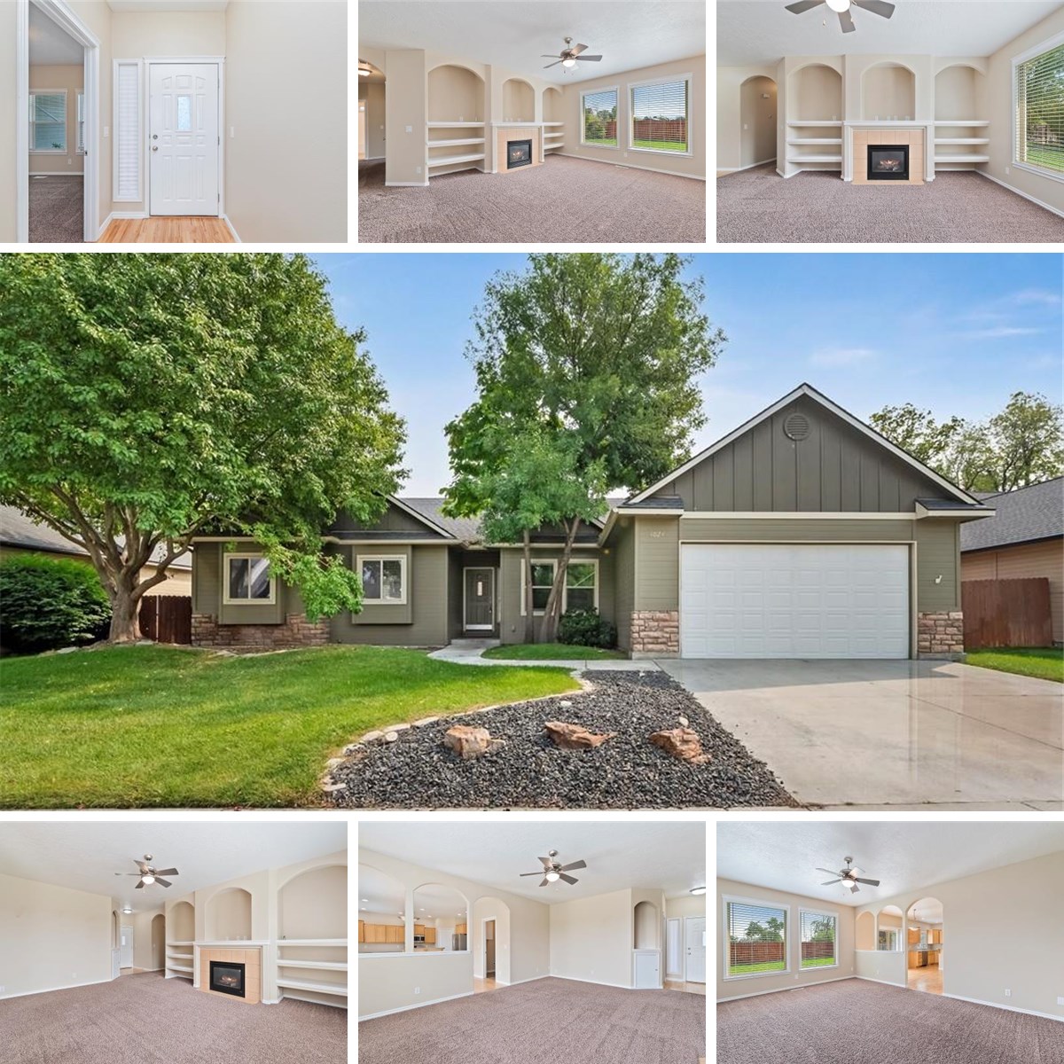 Tucked away in the desirable Great Sky Estates community, this Eagle home is situated in a peaceful cul-de-sac setting. Beautiful hardwood floors welcome you into the open layout, highlighted by a living room with a gas fireplace surrounded by built-in shelving and windows overlooking the backyard. The kitchen is well-appointed with stainless steel appliances, a corner pantry, and a built-in desk for added functionality. The private primary suite includes dual vanities and a walk-in closet in the ensuite. An oversized 2-car garage provides ample room for vehicles and storage, while the large, fully fenced backyard is perfect for gatherings or quiet evenings outdoors. Neighborhood amenities include a community pool, clubhouse, and playground.