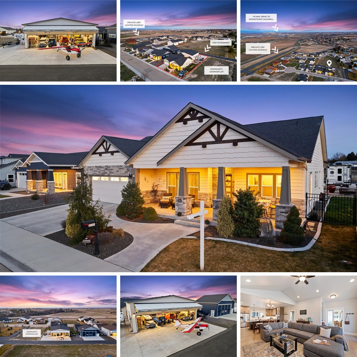 A RARE opportunity in Greenleaf Air Ranch, this property features a 50x36 heated attached hangar large enough for 7 cars, 2 bush planes, or 1 Cessna, plus additional trailer, RV, or boat parking — ideal for aviation enthusiasts, collectors, and anyone needing serious space. The hangar includes a 10,000 lb, 13-ft car lift. Enjoy direct access to the community airstrip with less than an hour flight to Sun Valley or the Frank Church Wilderness. Relax in the hot tub on the stamped concrete back patio, complete with a gas line plumbed for BBQ. Built in 2020, this 3 bed, 2 bath home offers approximately 1,930 sq. ft with vaulted ceilings in the great room and bright, open-concept living. The kitchen features a 5-burner gas stove and flows seamlessly into the dining and living areas. A finished attached 2-car garage adds additional function and storage. All just 40 minutes to downtown Boise or Ontario, Oregon, blending rural freedom with city convenience.