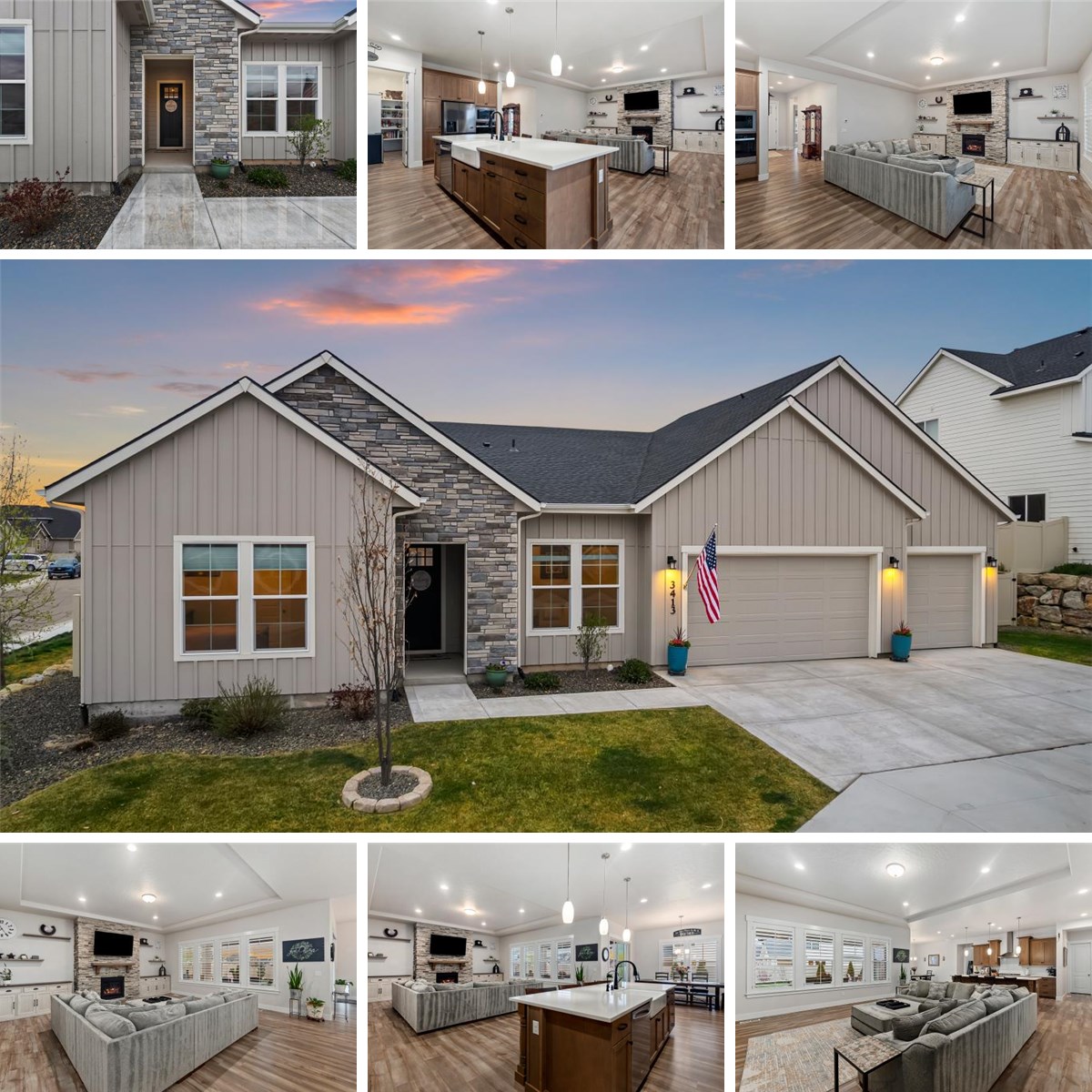 This single-level home in Collina Vista subdivision offers a practical and stylish layout in the growing town of Star. The entryway opens into a versatile front sitting room, leading into a spacious main living area centered around a floor-to-ceiling stone gas fireplace framed by floating shelves. The kitchen is well-equipped for daily life and entertaining, featuring quartz countertops, a farmhouse sink, and a roomy walk-in pantry, and a reverse osmosis drinking water system. In the master suite you’ll find a functional pocket office or sitting room, while the attached bath includes dual vanities, a tiled shower, and a separate soaker tub. Modern comforts include a water softener and dual-zoned HVAC systems with separate thermostats for precise climate control.The outdoor space is designed for year-round enjoyment, featuring a covered patio with a ceiling fan and sun shades, plus a backyard firepit perfect for evening gatherings and watching the Idaho sunsets. Residents of Collina Vista also have access to the community pool and local walking trails, providing easy options for recreation right in the neighborhood. The location is especially convenient given the ongoing Highway 16 expansion project. This major infrastructure work is connecting Star directly to I-84 via a new freeway corridor, which will significantly streamline travel to Meridian, Nampa, and Boise once complete. This home offers a great balance of quiet living with improved accessibility to the rest of the Treasure Valley. Call your agent to schedule a showing today!