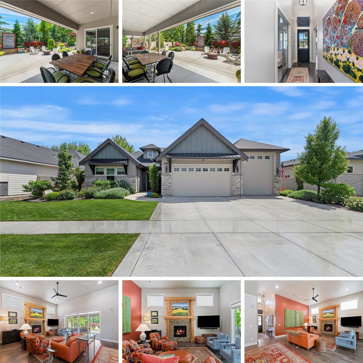 Nestled in Eagle’s serene Senora Creek, this exquisite home is a vision of beauty, inside & out, complete with a spacious RV garage! The backyard is a masterpiece—an oasis enveloped by towering, majestic trees that ensure privacy, complemented by vibrant flowers & lush shrubbery, a sight you must experience for yourself. Multiple patios offer versatile spaces for entertaining or unwinding. Step inside to discover a contemporary haven with soaring volume ceilings & a cozy, statement fireplace anchoring the great room. The gourmet kitchen dazzles with striking tilework, custom cabinetry & sleek quartz countertops, flowing seamlessly into an adjacent bar area ideal for a coffee or beverage nook. The primary suite is a sanctuary, with large windows showcasing the lush backyard & an ensuite featuring a luxurious freestanding soaker tub & an expansive tiled walk-in shower. Two oversized secondary bedrooms share a convenient jack-and-jill bathroom & a dedicated office with a closet provides easy storage & workspace.