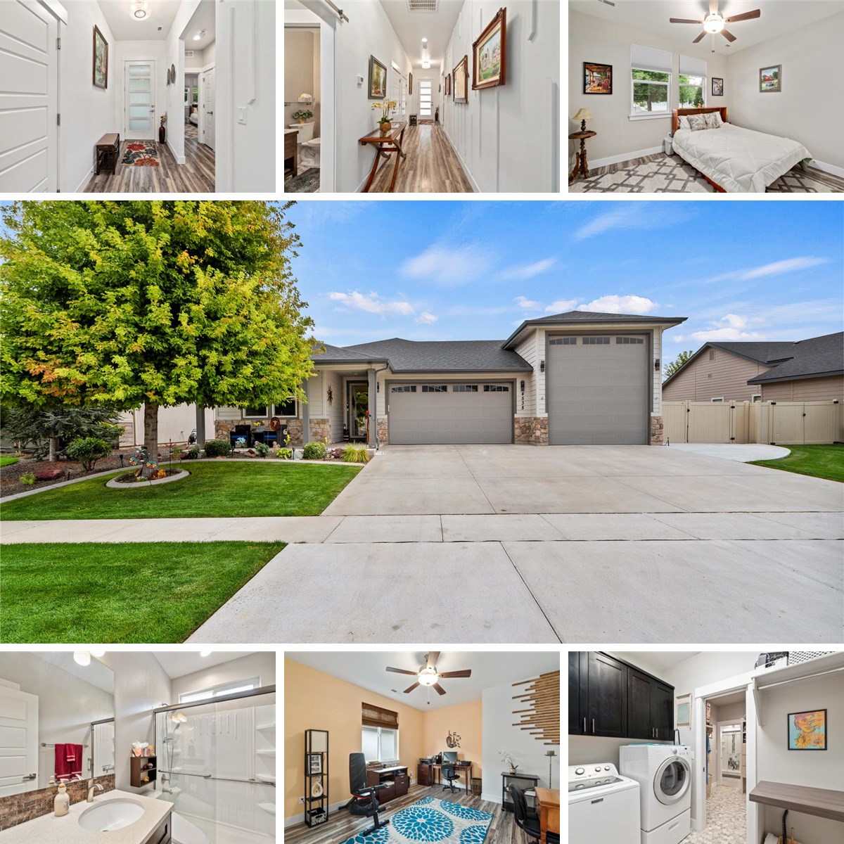 This gorgeous 3-bedroom, 2-bath home sits on nearly a quarter-acre lot with a 35' RV garage. Thoughtfully designed, quartz countertops throughout, soft-close cabinetry, and oversized rooms — including a generous master suite with a huge walk-in closet and laundry room pass-through. Expansive great room with custom cabinetry, entertainment center in the living room, including a coffee bar off the kitchen with additional storage. Upgrades continue with a beautiful enclosed sun room and an additional covered patio with a custom Hot tub area. Paved side yard and gate for all of your toys, including a shed for more storage. Every detail has been crafted for style, function, and quality — all at an exceptional price.