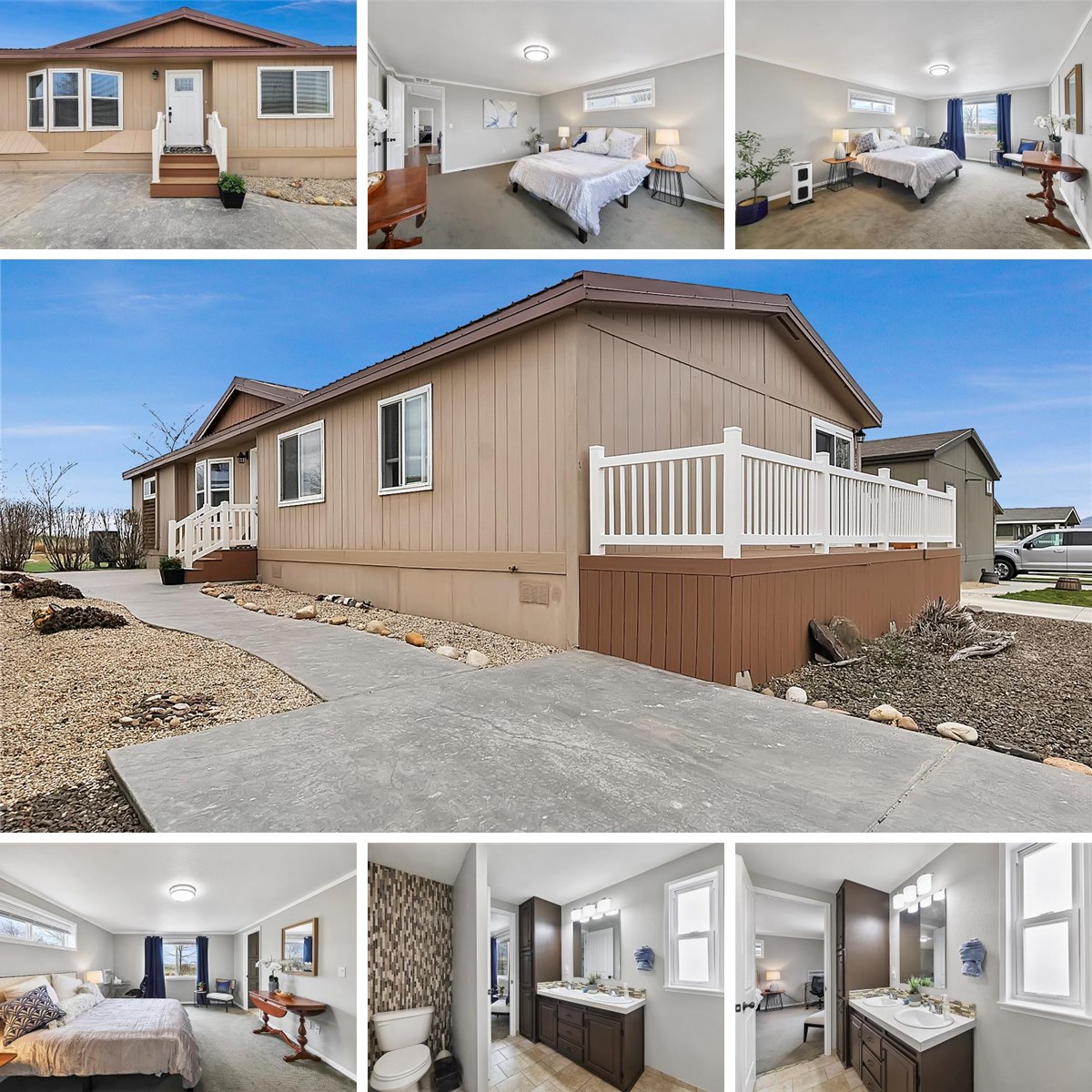 Spacious 4-bedroom, 2-bath manufactured home built in 1995 located in Blue Valley Lakeside Community in desirable SE Boise! This well-maintained home features an open-concept layout with vaulted ceilings and abundant natural light. The kitchen offers plenty of storage and counter space, perfect for everyday living and entertaining. The split-bedroom design provides privacy, with a generously sized primary suite featuring beautiful sunset views, an attached full bath with walk-in shower, and convenient access to the laundry room. On the opposite end of the home, you’ll find three additional bedrooms, each with a walk-in closet for great storage and one bedroom with access to the east-facing deck, perfect for enjoying the summer mornings. Updates include a heat pump (2020), hot water heater (2021), and a durable metal roof for long-term peace of mind. Outside, enjoy a private backyard with a stamped concrete patio, mature landscaping, garden area, and expansive views across open desert. Two long driveways provide ample parking, all in a convenient location near Micron and easy I-84 access. Lot rent is $690 plus $65 for water and sewer. BTVAI Welcome Home!