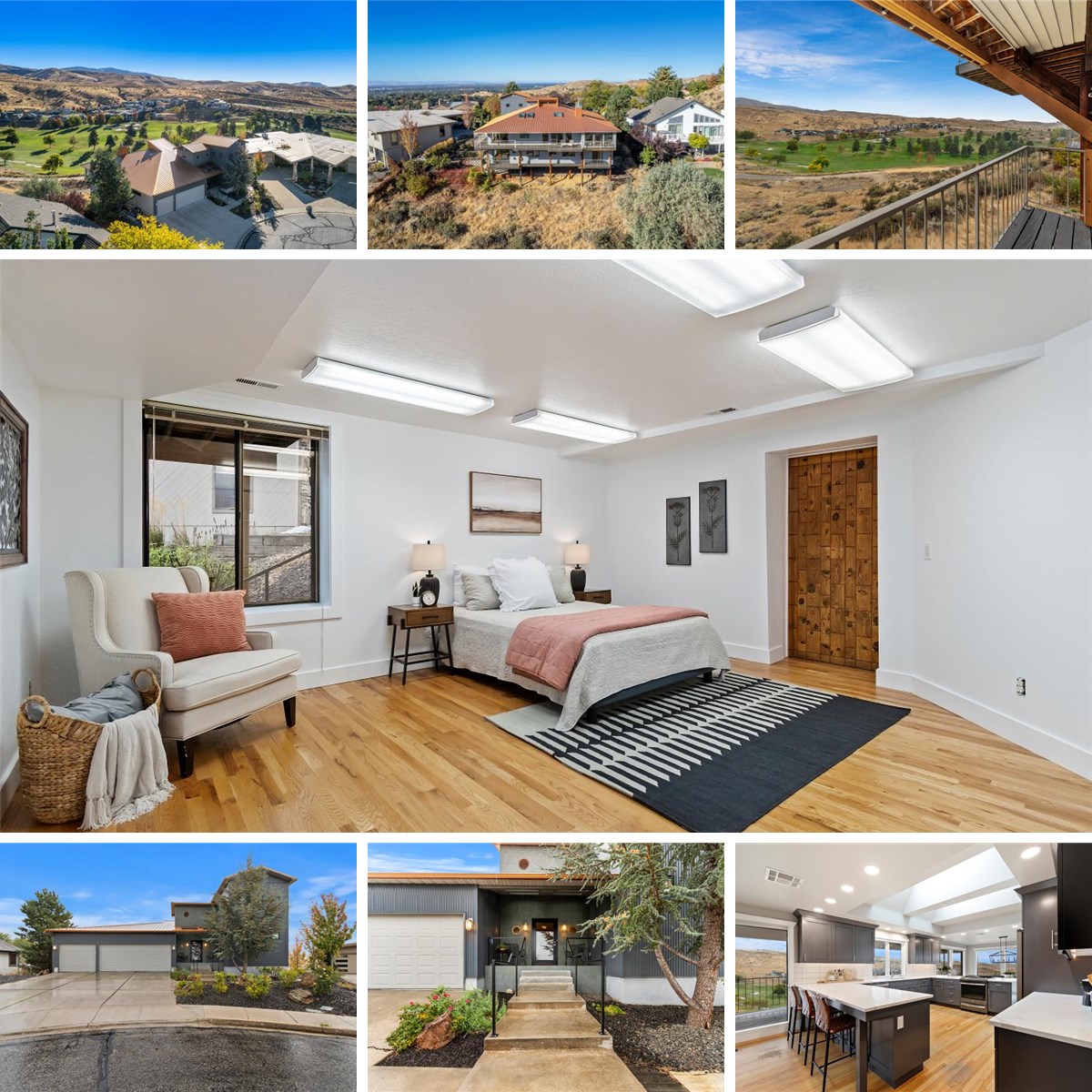 VIEWS, VIEWS, VIEWS! This home sits on one of the most premium lots in the area, offering incredible East-facing views over Crane Creek GC & breathtaking mountain vistas. Whether you’re in the mstr bdrm, kitchen, dining, living/family rooms, or from the 2 spacious decks (upper and lower) you’ll enjoy stunning scenery! •New quartz counters, fresh paint & finished 3 car garage w/epoxy floor! •Hardwood floors, main floor master suite w/a walk-in shower, & large office w/custom wood door! •Upstairs Crow’s Nest/Bonus Room offers the perfect spot for a movie/play or another bdrm. •Lower level features 2nd en-suite bdrm, 2nd family room, safe room/wine cellar, craft room (formerly 2 bdrms, now combined into 1) & an additional bdrm! This home could easily have up to 7 bedrooms •Perfect for entertaining w/2 expansive decks, ideal for enjoying the panoramic views •Located in a prime elevated position above Crane Creek GC, offering unparalleled view! This is a one-of-a-kind home, don’t miss out on this rare opportunity!